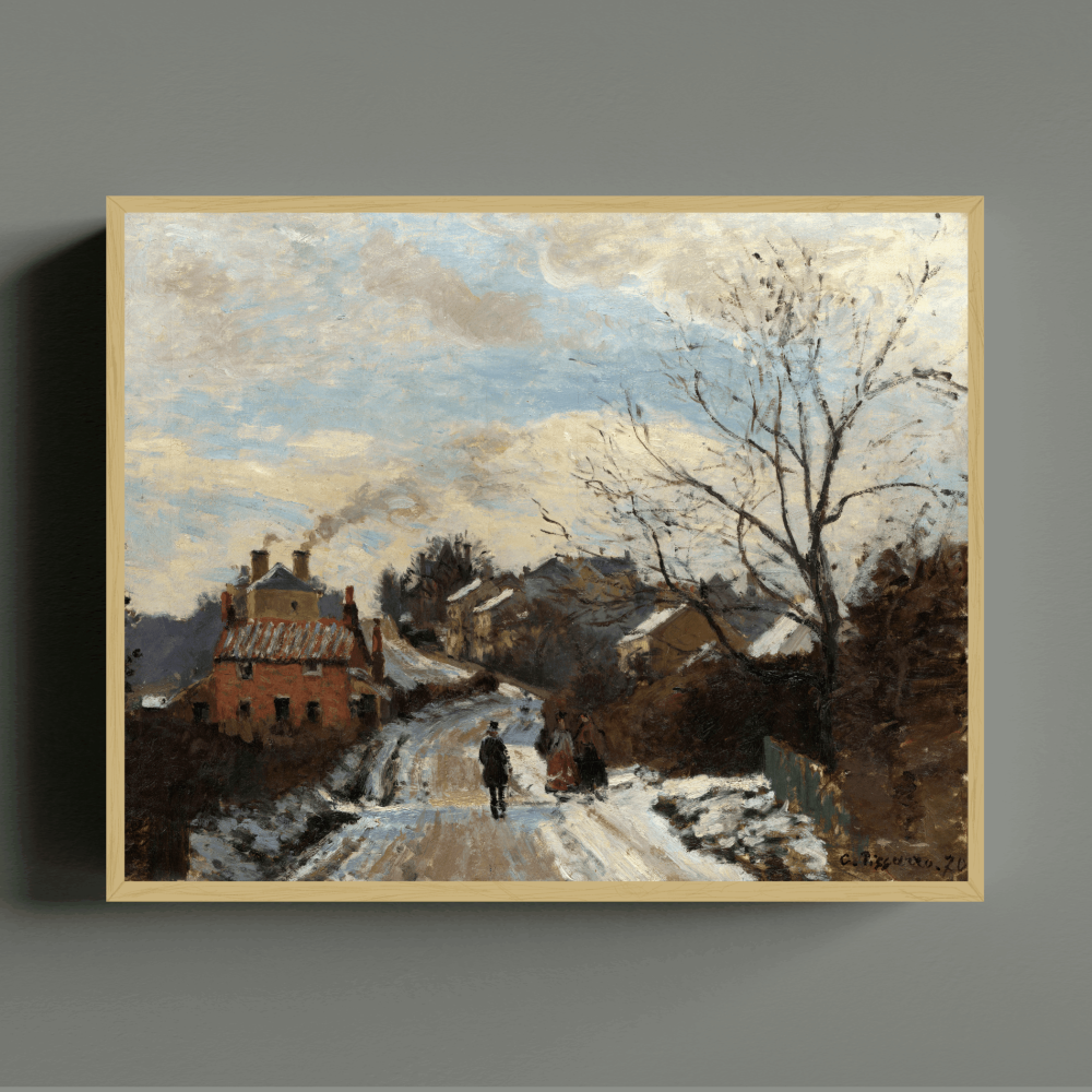 تأخذنا هذه اللوحة إلى ضاحية إنجليزية هادئة تغطّيها بقايا الثلج، حيث يمتزج الواقع بالحنين في مشهد طبيعي نابض بالحياة رغم سكونه. اختار بيسارو أن يصوّر الشارع في لحظة عابرة من يوم شتوي، حيث الدخان يتصاعد من المداخن، والأشجار بلا أوراق، والمارة يسيرون بهدوء على الطريق. كل عنصر في اللوحة يوحي بشيء من السكينة الهادئة التي تنطوي على شعور بالانعزال، وربما بالغربة.